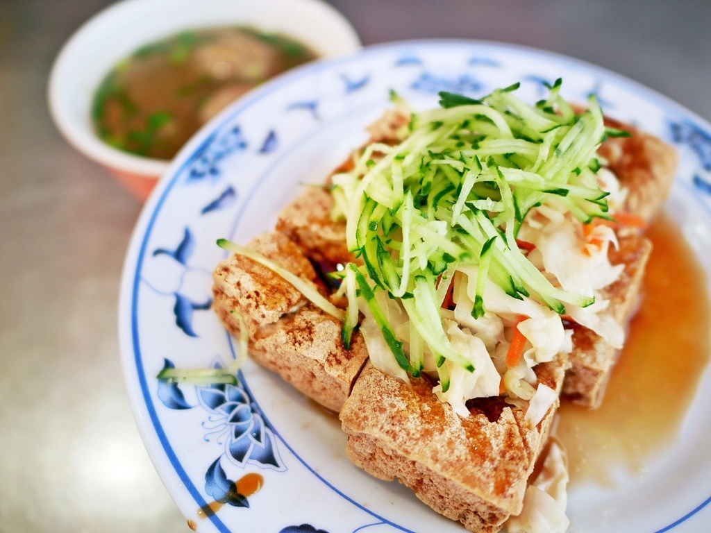 太平臭豆腐這家數一數二低調,「一江橋香酥臭豆腐」藏身在鐵網內,只露出一個小小的外推招牌,如果不是專程來找或走另一側,肯定不會留意到而直接錯過。不過一江橋臭豆腐的人氣還不低,下午時段人潮蠻多,炸到外酥內嫩的臭豆腐搭配滿滿泡菜,再來一碗湯是標配。