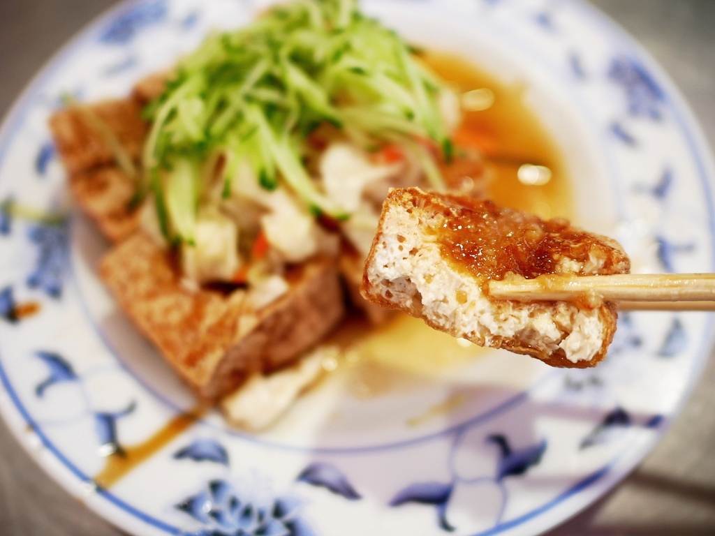 豆腐一份有五塊,外層炸到挺酥脆但不會乾硬,一口塞也不會割嘴巴。中間的豆腐肉很飽滿不空洞,臭度不算高但整體味道和口感表現不差,咬下也蠻多汁。