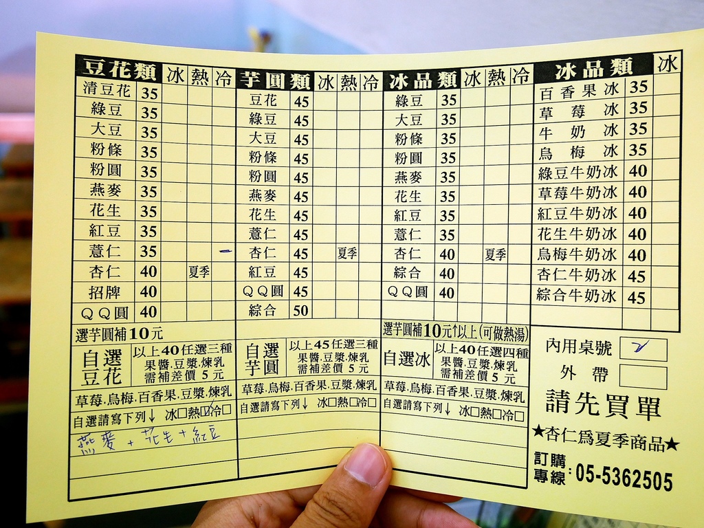 先送上82豆花菜單,店內主打3大類,豆花、芋圓、冰品,配料選擇很多元,重點是甜度都很適中,不會越吃越口渴。其中杏仁是夏季限定,喜歡這一味的朋友可以準備出發。自選豆花、芋圓和冰品可以從上頭的配料自由挑選,其中豆花每天熱騰騰出爐,所以即使夏天也有熱豆花可以選 (歡呼) ~