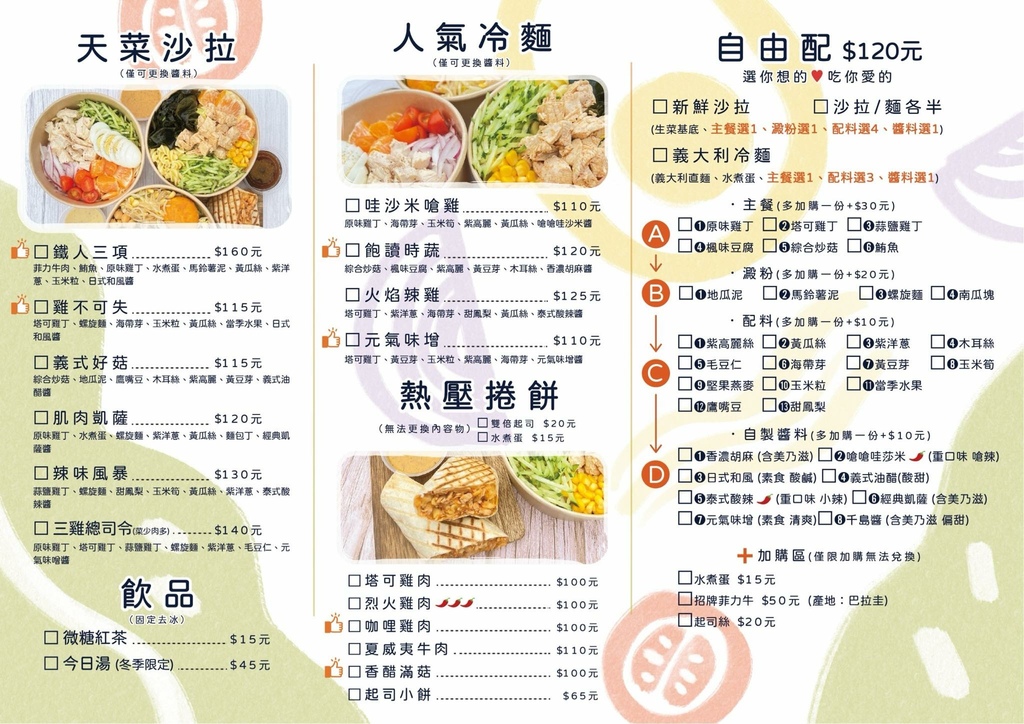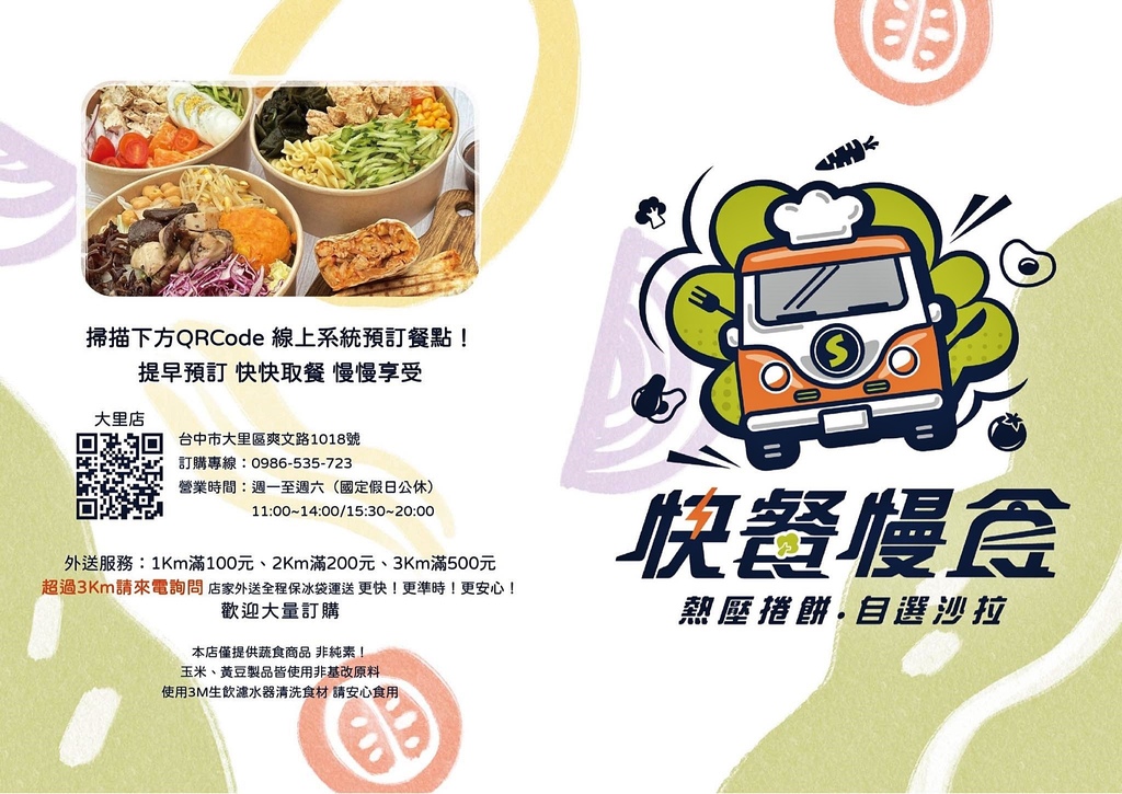 附上快餐慢食菜單,最新的菜單增設沙拉和冷麵各半的選擇,熱壓捲餅的口味也更加多元。