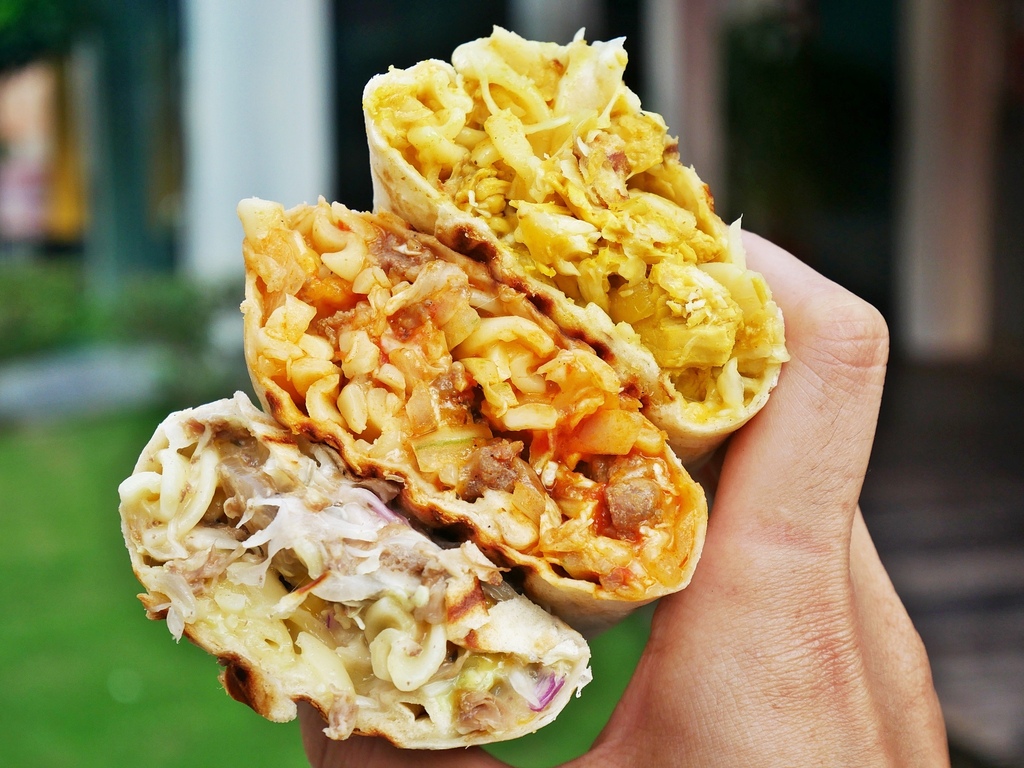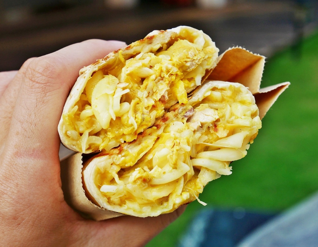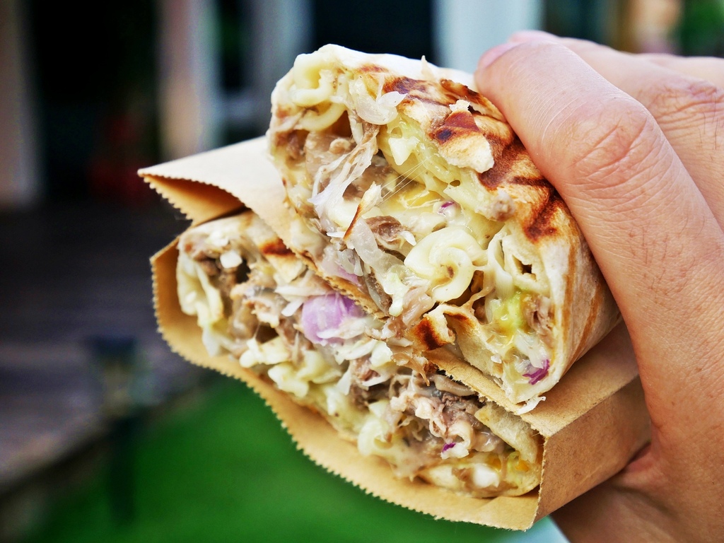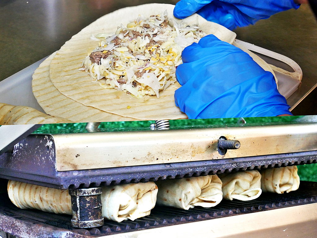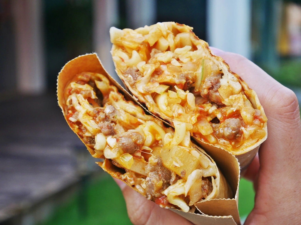 熱壓捲餅的餡料相當飽滿,切開看剖面就知道。不同於以生菜鋪底的墨西哥捲餅,內餡以高麗菜絲、捲心麵、肉食和起司為主,不只清爽可口,還兼具飽足感。