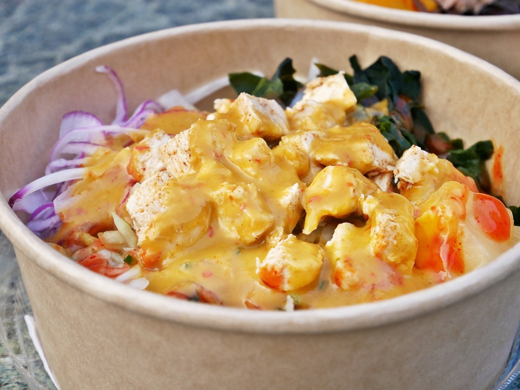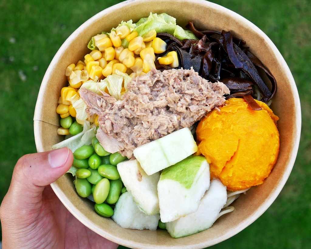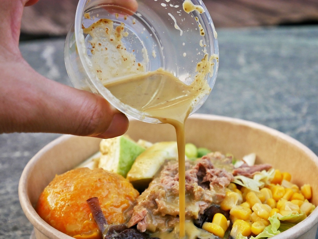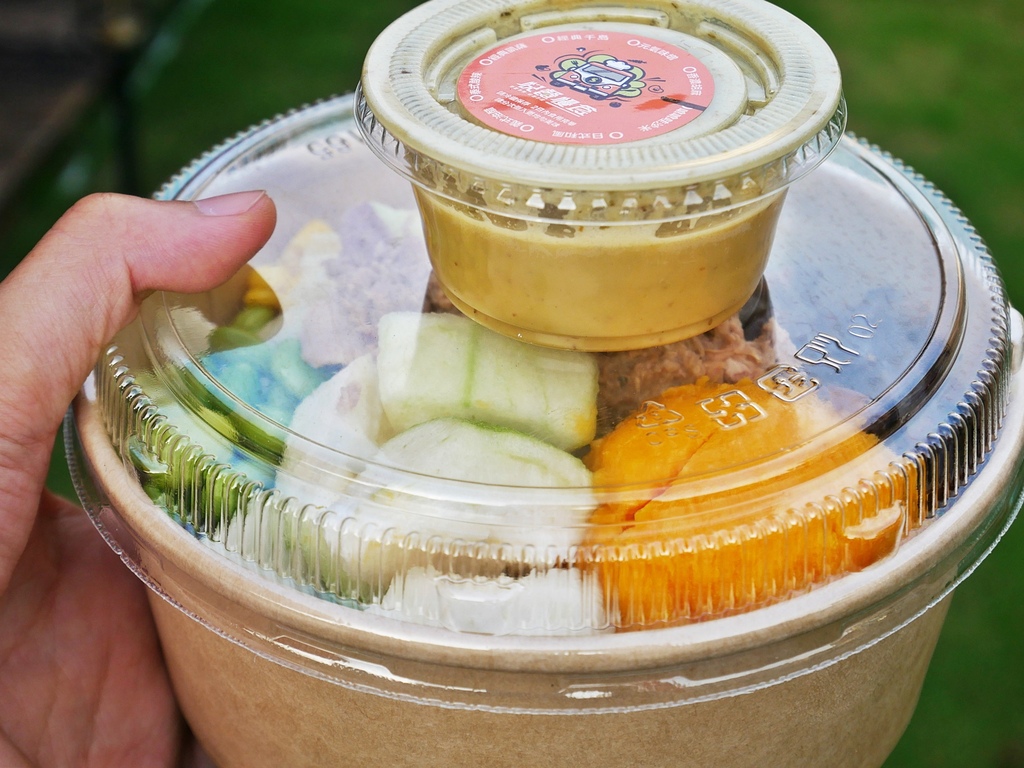 第一次品嘗嗆嗆哇莎米,這款醬汁內加了不少芥末籽,吃起來嗆辣度不高,不會一入口就直衝腦門,但又能品嘗到淡淡芥末香,非常順口,用來搭配有生菜的沙拉餐盒相當適合。細緻的鮪魚把醬汁緊緊抓住,還有香甜綿密的地瓜泥跟玉米也跟芥末醬很搭,爽脆芭樂新鮮好吃,一餐的纖維量達標。