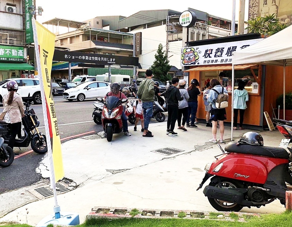 大里的快餐慢食自選沙拉位在爽文路上,就在「台灣房屋大里門市」的外頭,亮橘色貨櫃屋佔地不大,也僅提供簡易的用餐空間 (以外帶外送為主) ,但用餐尖峰前夕人潮意外不少。