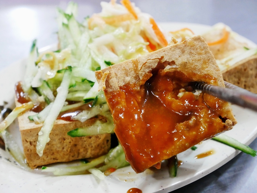 臭豆腐的皮很薄,表面炸到微酥不硬,好入口不會刮口腔還不錯。但中間的豆腐肉微軟,比較不具有吸湯汁的孔洞,所以醬汁跟豆腐的味道沒有很融合,也較不會吸湯小小可惜。好險醬汁給得很夠,咬下依舊能享受爆漿的快感。