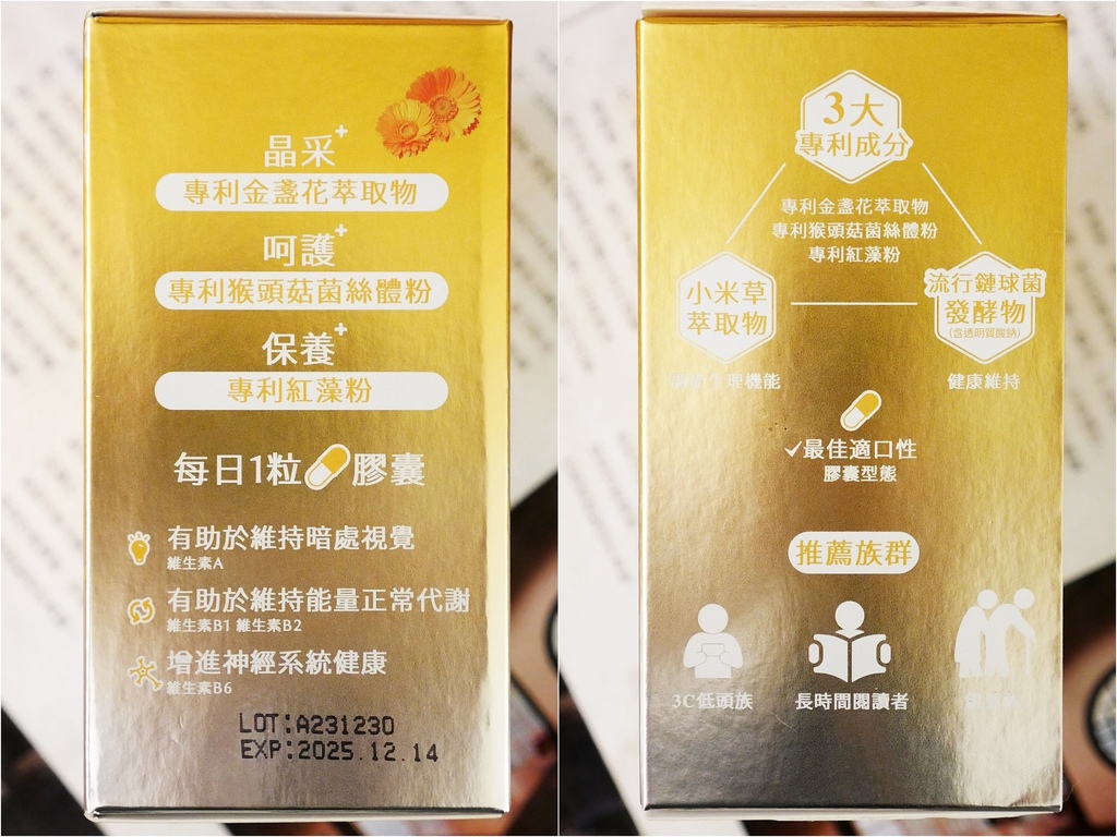 芳茲的NHB游離型金盞花葉黃素膠囊包裝很清楚,不管是成份、食用建議還是推薦族群都詳細羅列。市面上的葉黃素分成「游離型」和「酯化型」,游離型葉黃素較好吸收。