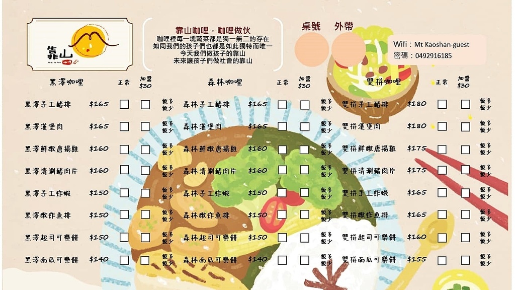 附上靠山咖哩菜單。店內咖哩分為濃郁的黑澤咖哩及微辣的森林咖哩,雙拼則是能一次擁有,讓顧客選擇障礙不發作。咖哩飯搭配的蔬菜有不少選自埔里在地小農產品,除了做孩子們的靠山,未來讓孩子做社會的靠山之外,也默默支持著南投的小農們。