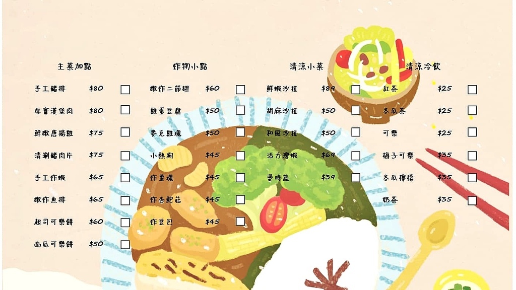 主食選擇蠻豐富,包含厚豬排、漢堡肉、唐揚雞、豬肉片、魚排和可樂餅這六大類。店內也提供各種炸物點心,食量大的朋友搭配享用更有飽足感。