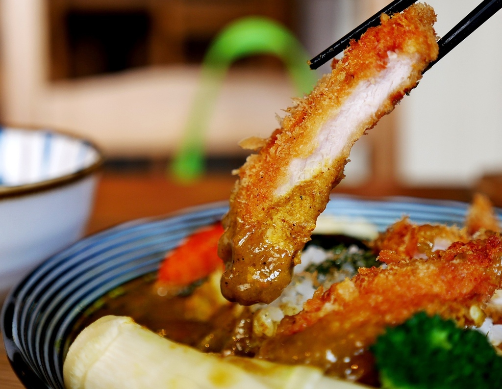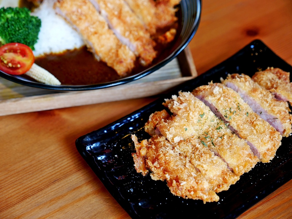 靠山咖哩的豬排蠻有厚度,搭配日式麵包粉炸成的麵衣酥脆不含油,即使慢慢吃放涼依舊不乾。豬肉本身有挑筋,所以肉感不會太硬,長輩也能咬得動。