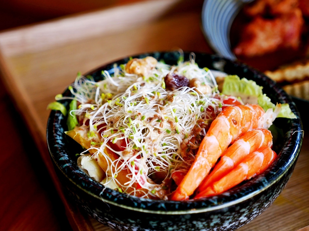 吃咖哩前來碗沙拉開胃一下,以美生菜、苜蓿芽、甜椒等多種新鮮生菜鋪底,綴上去殼蝦肉再淋上胡麻醬,蝦肉彈牙而醬汁鹹香濃郁搭配得剛剛好,沙拉看起來不大碗但份量卻很適合分享。