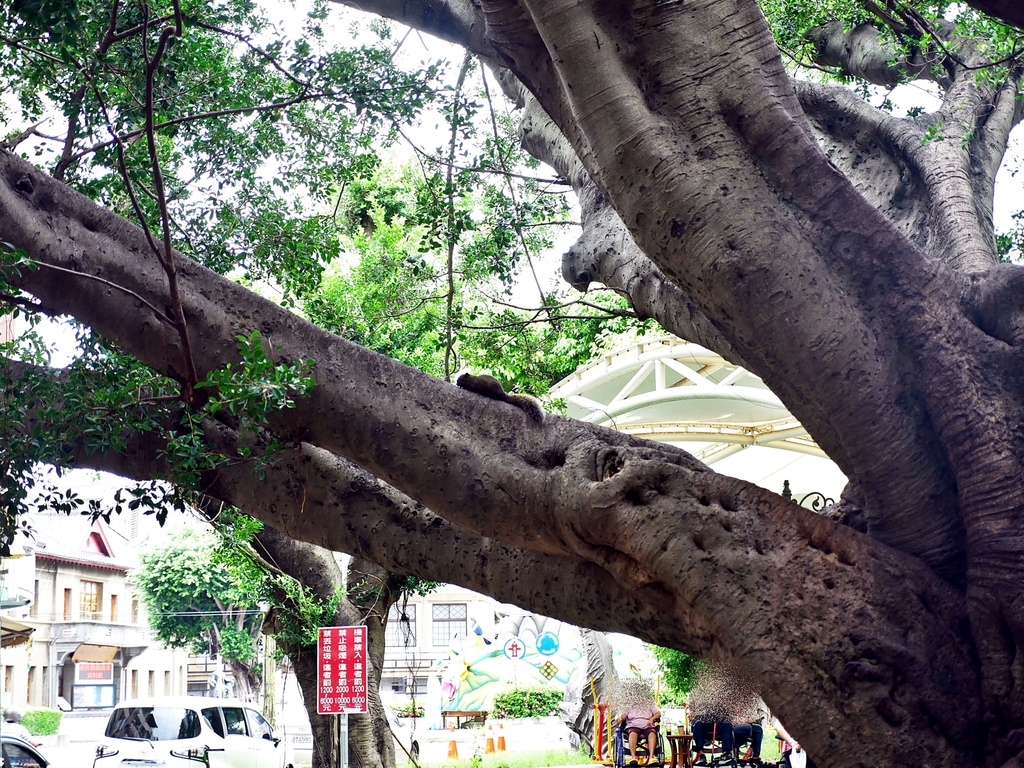 公園中間這棵百年榕樹種植於日治時期,枝枒生長得特別繁茂,樹冠對稱向上延展,將公園很好的保護在傘翼之下。