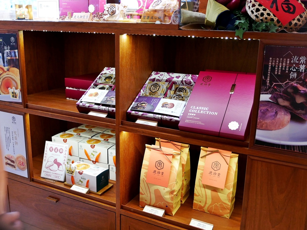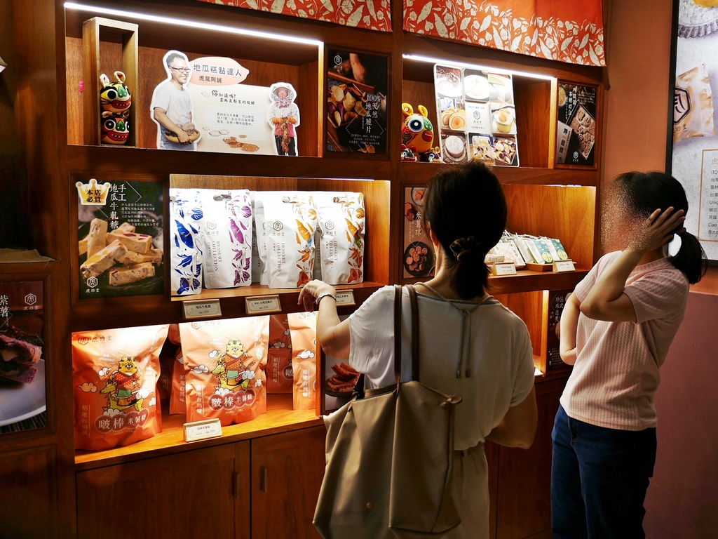 不愧是台灣唯一地瓜糕點專賣店,虎珍堂各式地瓜伴手禮整齊排列在展示櫃上。