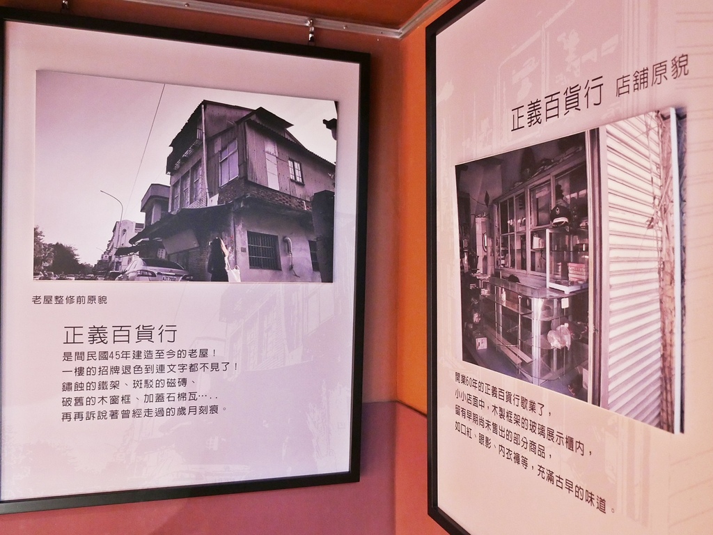 樓梯的牆面上掛著古宅原本的樣貌,本來這邊是一家叫 正義百貨行 的店舖,開業60年後來歇業,保留大量歷史的見證。