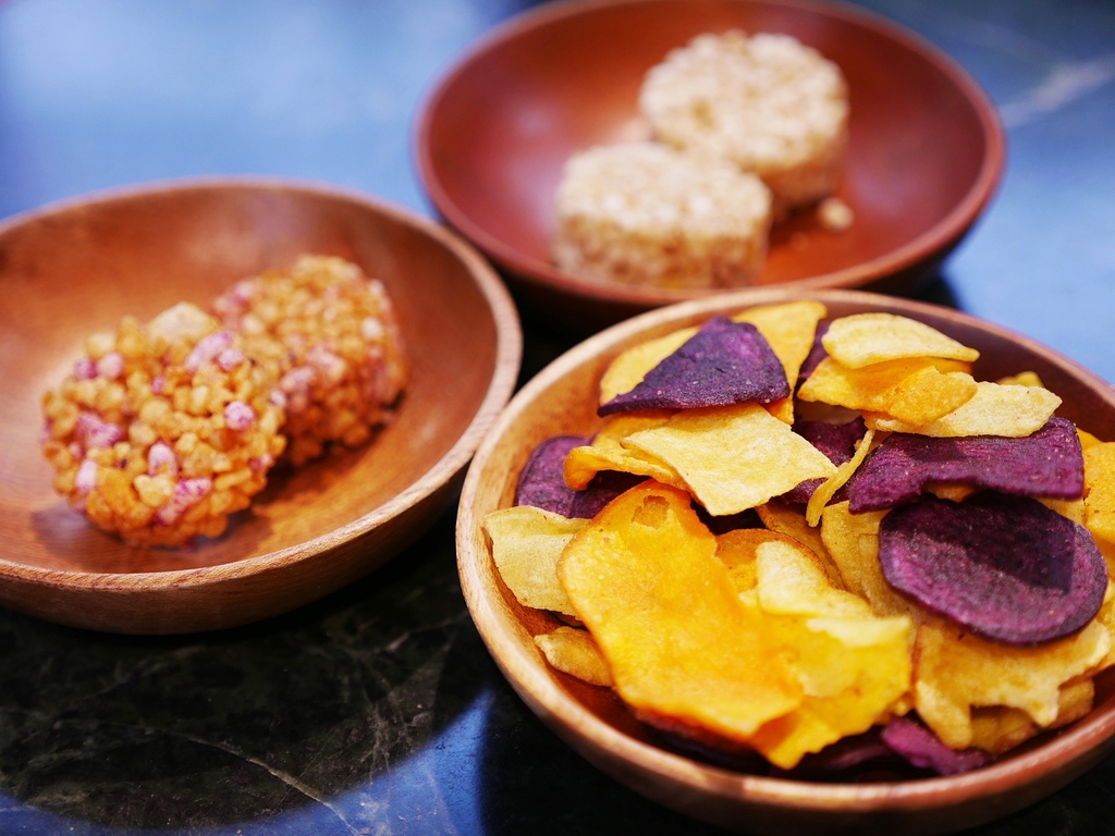 以三種地瓜製成的地瓜脆片以低溫烘烤取代高溫油炸,薄厚適中剛剛好入口也不會太硬。地瓜香氣濃郁且純粹,沒有額外撒糖粉甜度剛剛好很涮嘴。