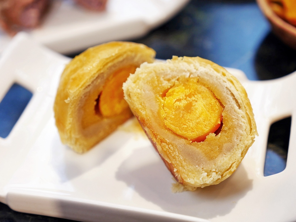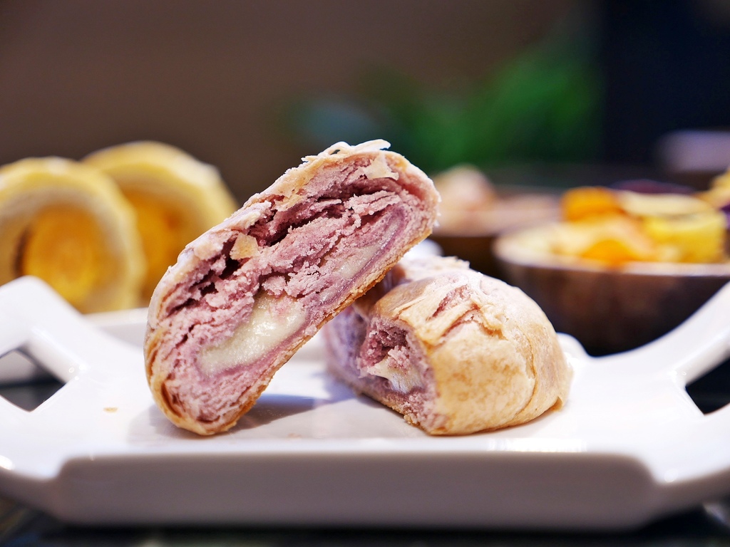 虎丸御皇吉是結合地瓜泥和芋頭泥的蛋黃酥,外頭酥餅不乾口,兩種泥餡也夠濕潤,三者香氣很和諧而且甜度剛剛好,整體以鹹蛋黃的香氣最為明顯,是送禮新選擇。