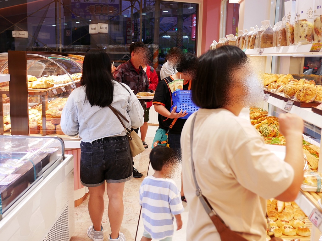 店員熱情招呼進門的客人嚐鮮,試吃的麵包切超大塊,完全沒在怕客人拿。