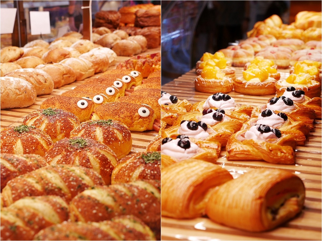 除了招牌變少女之外,店內配色也都很粉嫩。新鮮出爐的麵包一字排開,讓人好想每種都各來一塊。只見大家的盤子上都疊滿各種蛋糕麵包,瞬間變成糕點富翁。