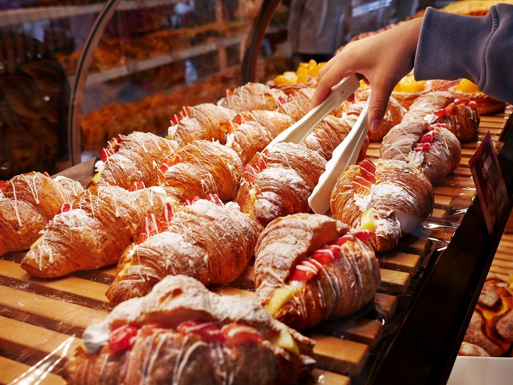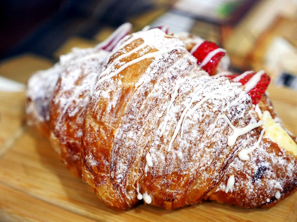 冬天怎麼能錯過草莓,酥香的可頌撒上象徵白雪的細糖粉,吃起來不會太甜好涮嘴。中間夾入新鮮草莓和布丁條,搭配起來不會太甜整體蠻耐吃。但記得買回家要立刻享用,不然可頌一旦受潮酥脆度就會大大降低喔。