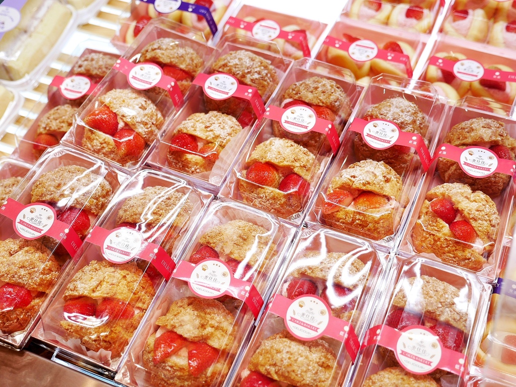 除了披上粉色外衣是一大亮點,最新引進的透明裸裝麵包櫃也好吸睛。擦到會反光的櫥窗內擺放各式精美的蛋糕甜點,口味不固定每天來都會更換。近期麥仕佳草莓季登場,昨天靜香迅速二訪,已經看到不少草莓系列商品陳列在架上。