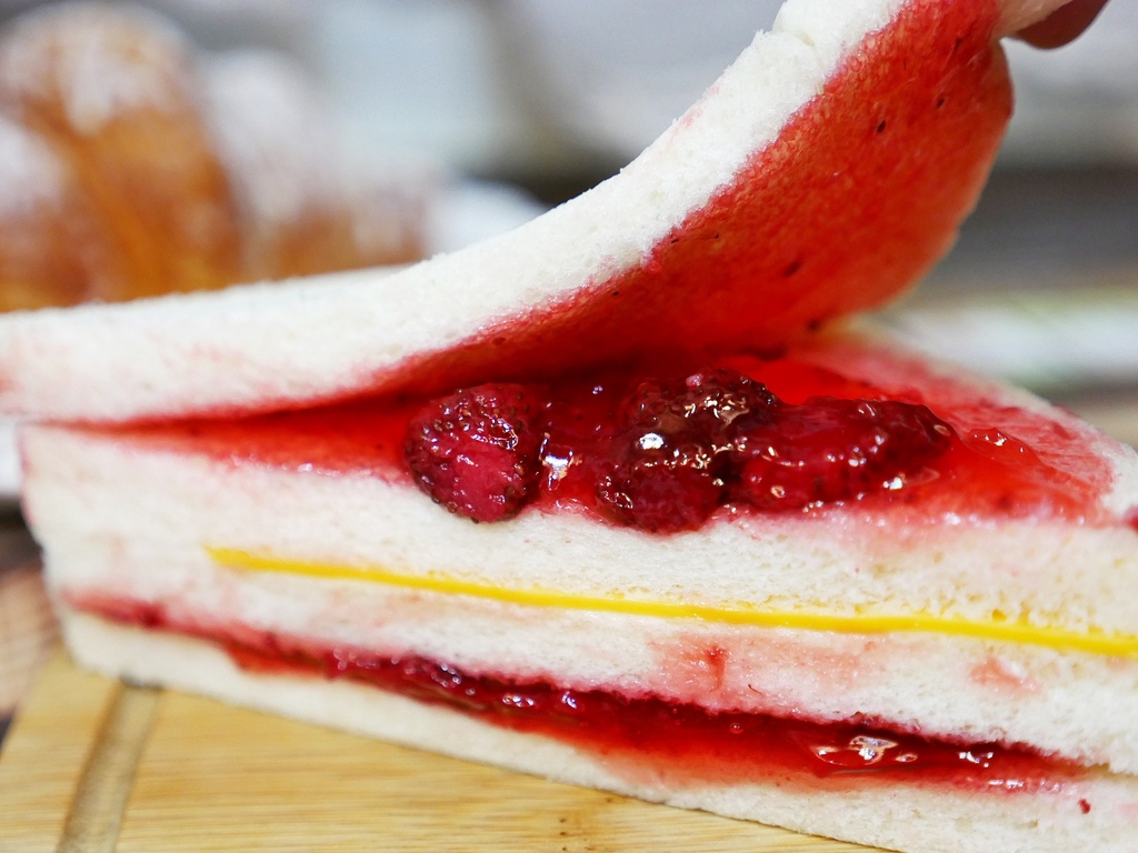 草莓三明治 (蛋奶素) 是兒童界的霸主,聽說沒有小朋友抵擋得住。鬆軟吐司抹上厚厚一層草莓醬,大塊草莓果粒看得見,用料特別大器。