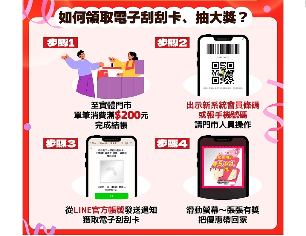 除了有好康之外,碰巧遇到歲末年終,麥仕佳全台14間門市聯合推出大禮包。只要成功登錄新系統會員並完成登記,在任一門市消費滿200就送電子刮刮卡,每筆消費最高可獲得5張。每張刮刮卡都藏著好禮,100%中獎機率真的超大器。