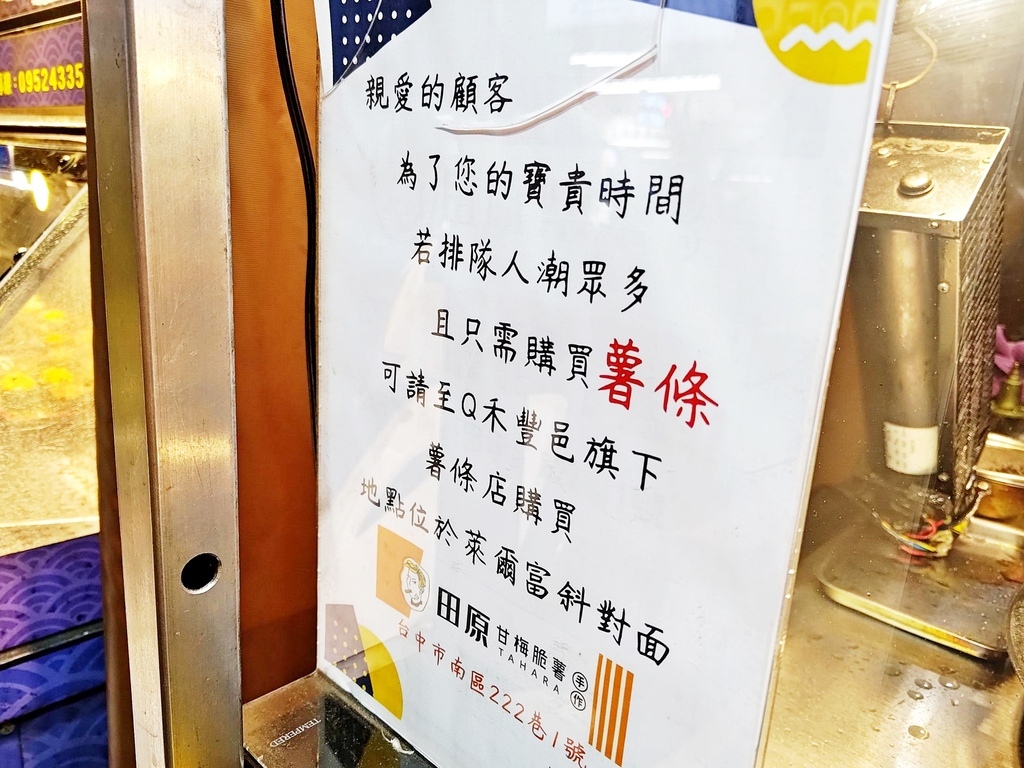 地瓜薯條的快速通關在這邊,如果只要買薯條,可以到田原甘梅薯條購買,這是地瓜球旗下品牌,但口味和品質是否相同這點就不清楚了。