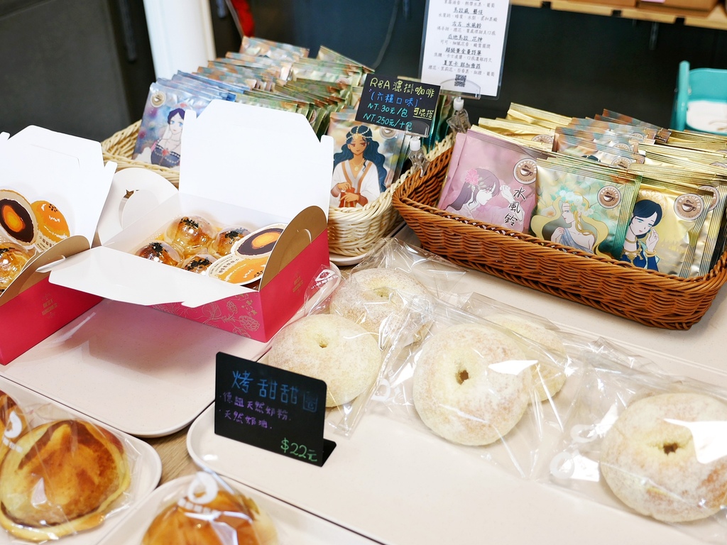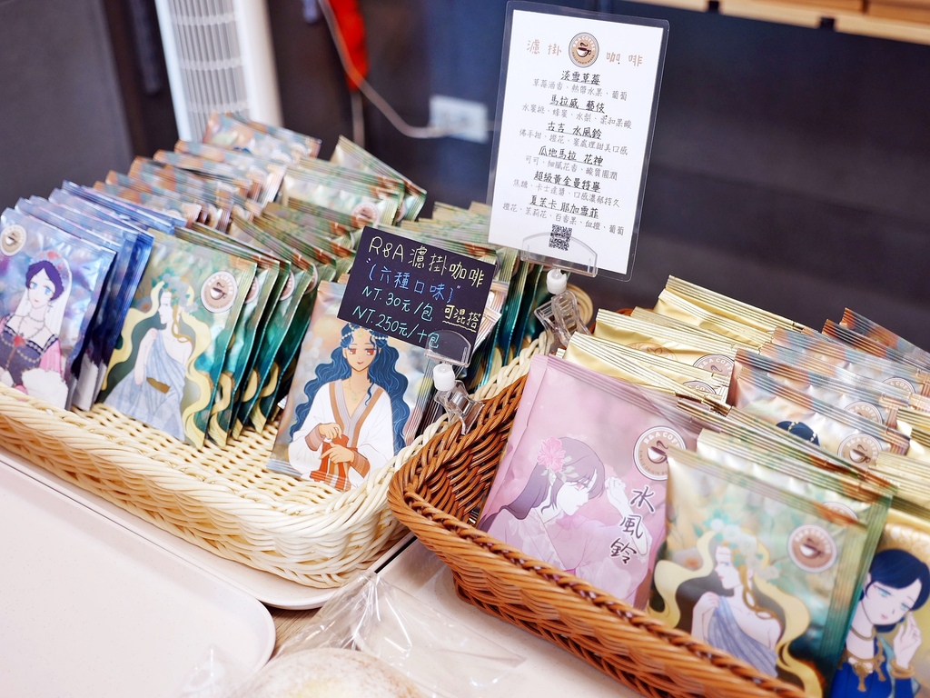 麵包後頭還有濾掛咖啡,闆娘介紹說這是客人寄賣的,口味還不少而且包裝的圖樣通通自己設計,好適合一起買回家當下午茶。
