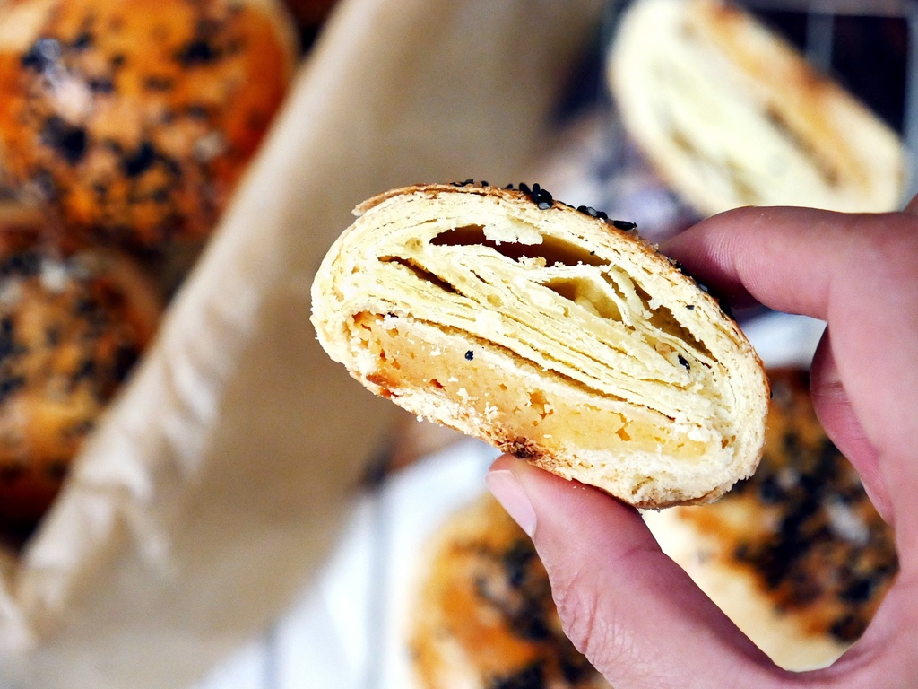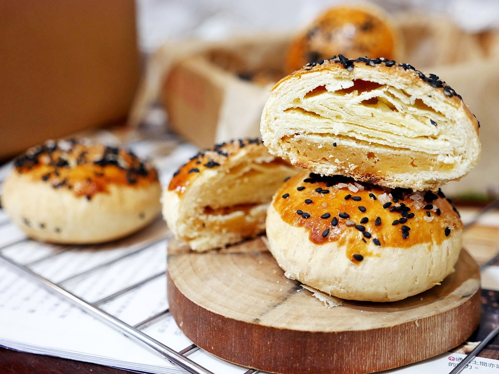 小爺爺麵包車的甜燒餅切面不空洞,除了表面綴上芝麻和鹽之花的餅皮特別酥香,中間一層層的餅也薄脆不乾口,搭配上特製的甜燒餅內餡,吃起來有點像大甲奶油酥餅的夾餡,但沒那麼黏牙,甜度也被鹽之花平衡得剛剛好,真的很好吃。