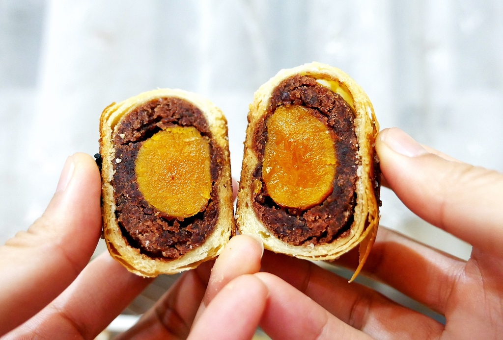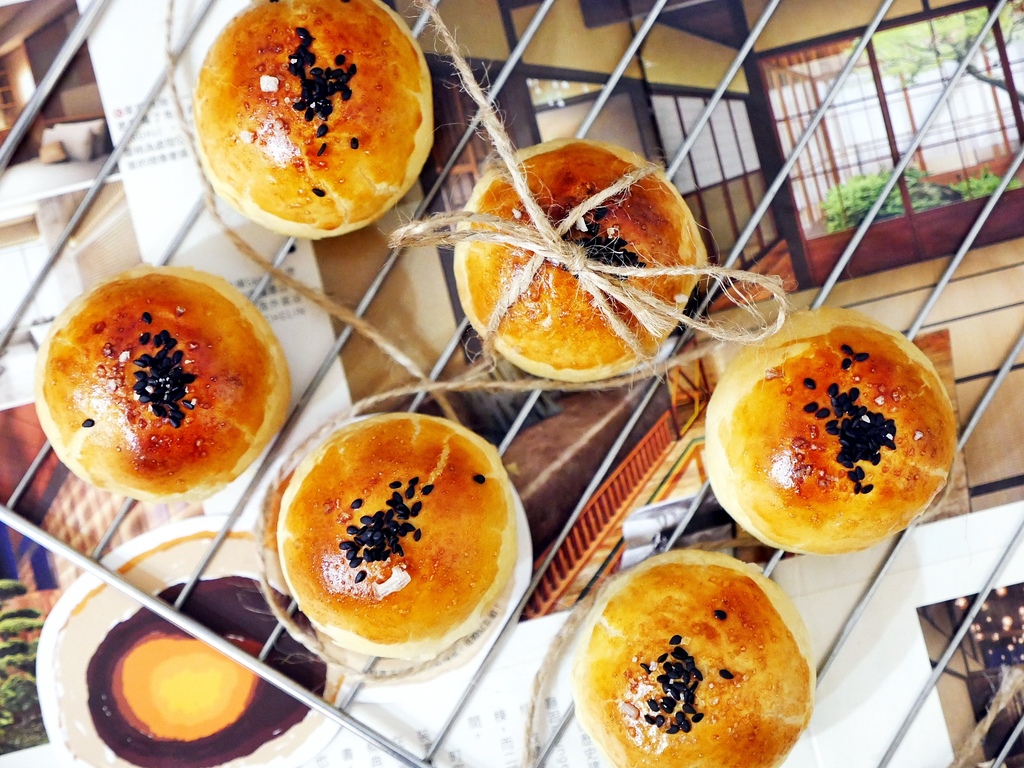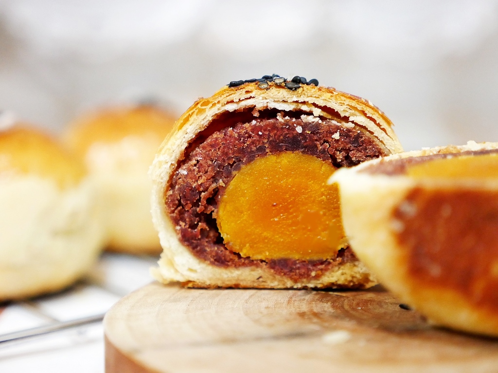 不同於一般蛋黃酥選用烏豆沙,小爺爺麵包車的蛋黃酥中間夾入綿密且保留些許紅豆顆粒的低糖紅豆餡,搭配上紅土鴨蛋黃,鹹甜組合讓人想一口接一口。
