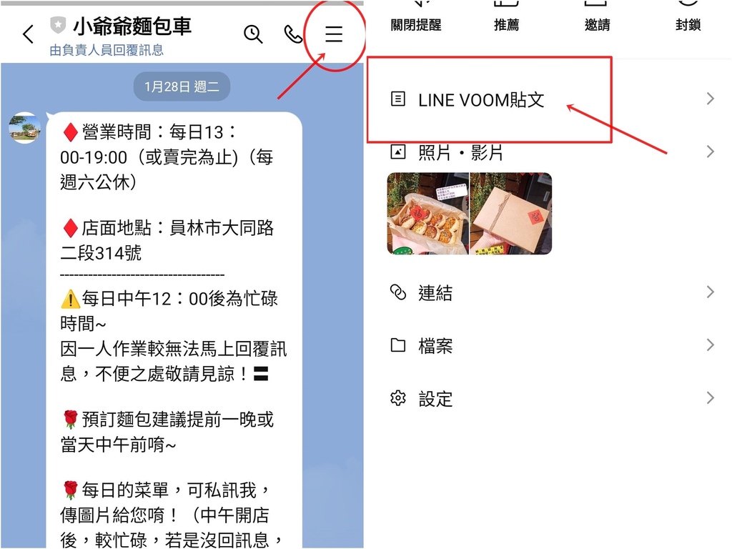 隔日的麵包品項會在前一晚PO上LINE VOOM貼文,挑選好口味再跳回(左圖的地方)留言預訂喔!