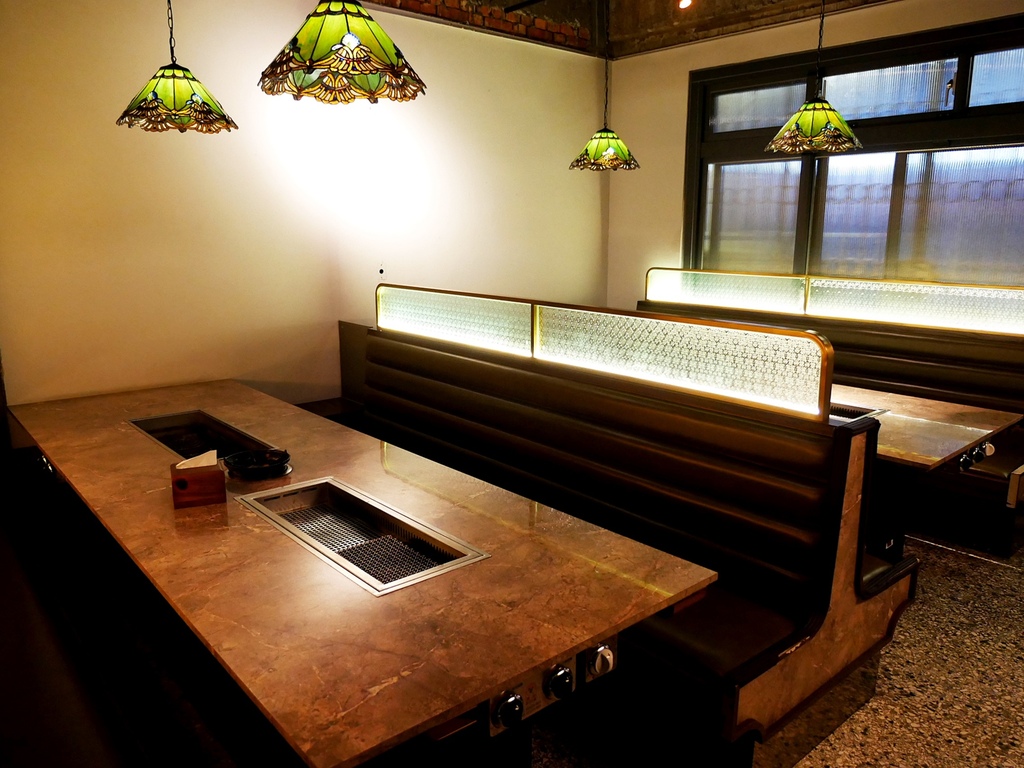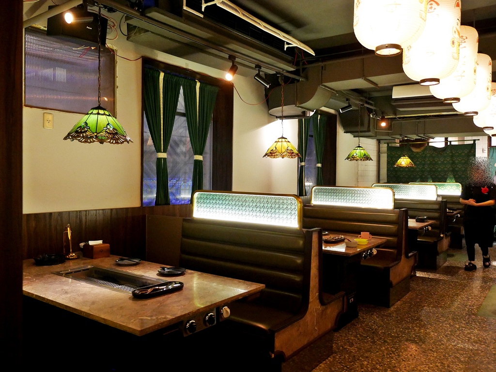 壹山燒肉 的店內裝潢相當復古,木製桌椅配上淺綠馬賽克玻璃,以及結合燈籠的暖黃燈光,懷舊感十足。