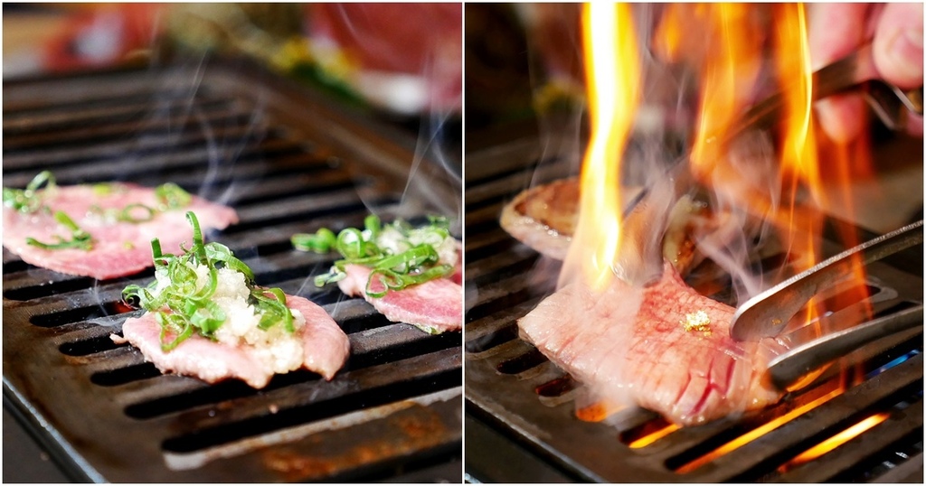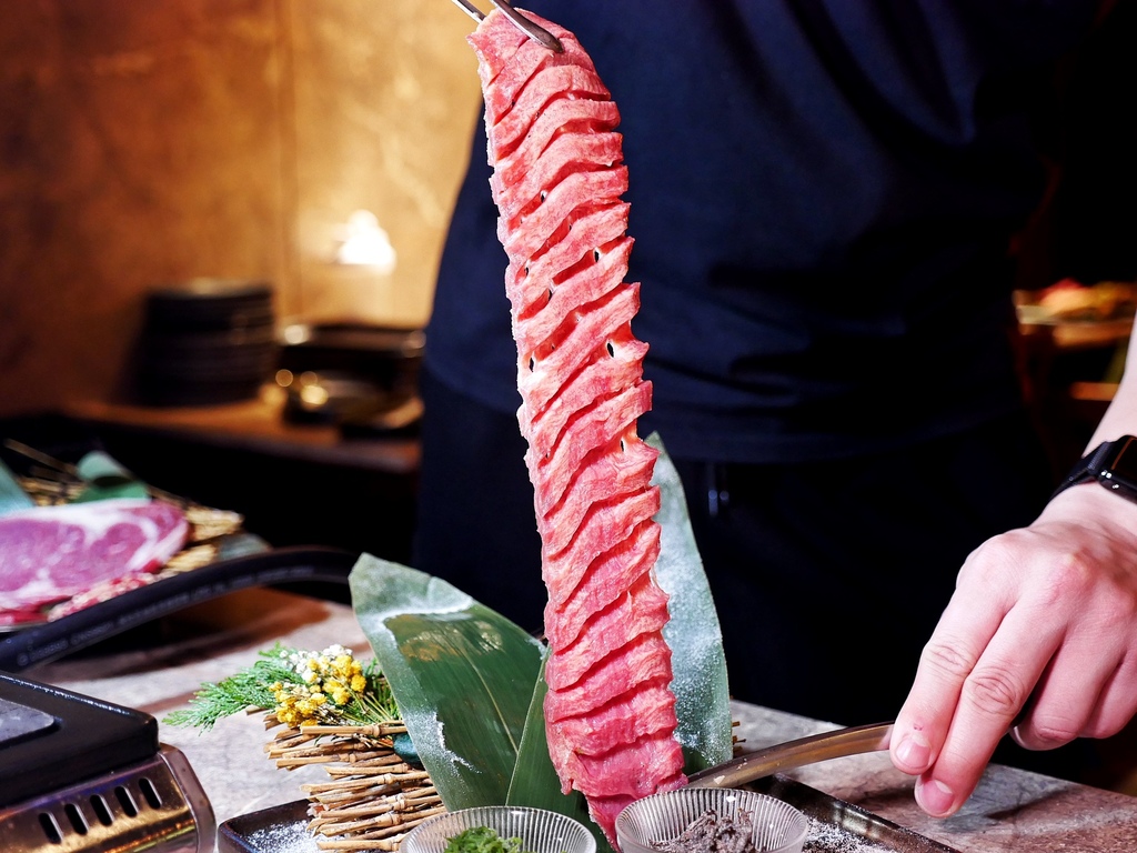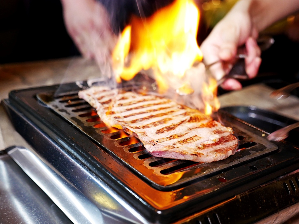 隨著牛肉被架上熱騰騰烤爐,滋滋作響的燒烤聲在耳邊迴盪,只見服務員像是表演一般,迅速帶著牛肉涮出熊熊火焰,畫面感十足。