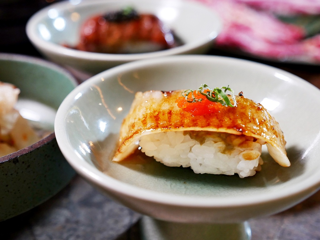 比目魚鰭邊肉表面微炙燒,大大增添口感上的層次,魚肉特別細緻,夾著鮮美的松葉蟹膏一起品嘗超好吃。明明是燒肉店,沒想到端出這麼有水準的壽司,真的驚喜到我。