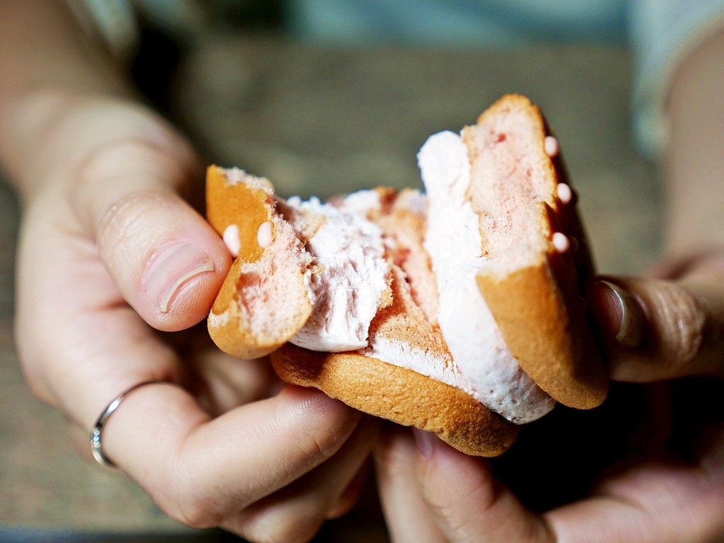 銅鑼燒竟然是卷卷烘焙的超人氣點心!! 草莓造型的草莓冰心銅鑼燒甜度不高,淡淡草莓香氣也好適合當成收尾。