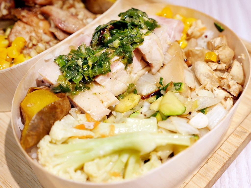 杉盒的便當每個都沉甸甸,圓木盒便當在米飯上頭舖了蔬菜和肉食,配菜好像每天不固定,買過兩三次都不一樣。