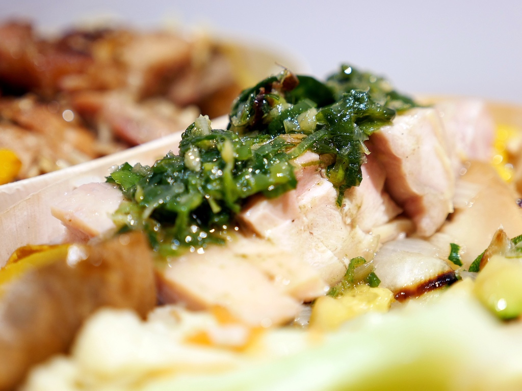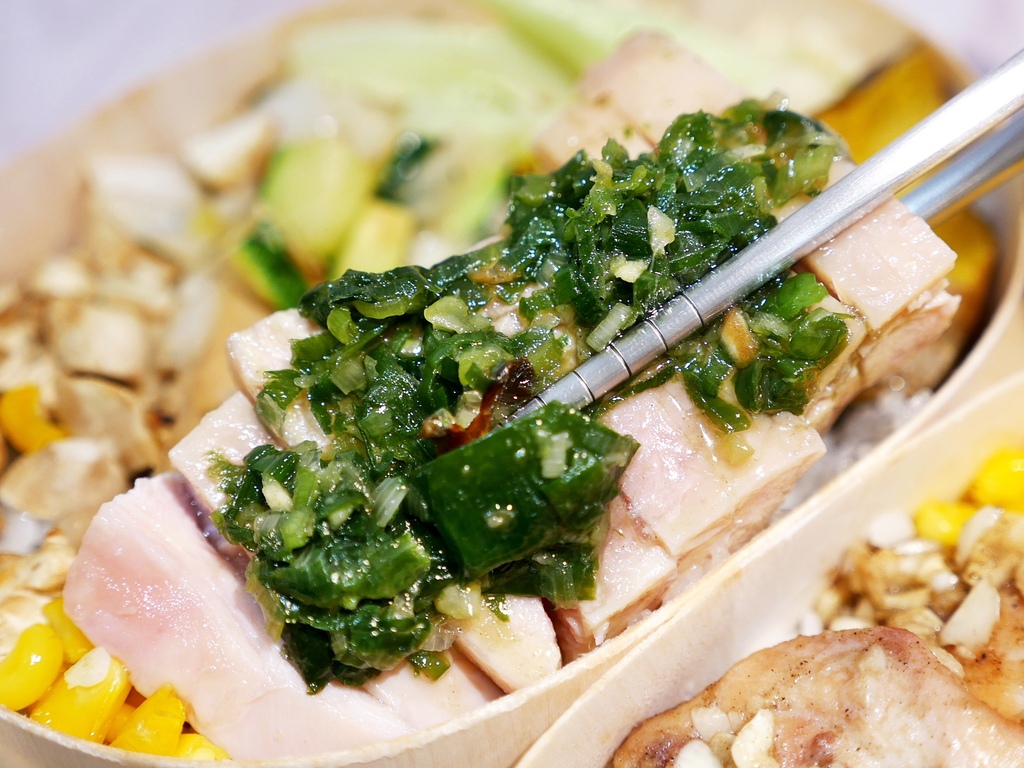 杉盒的海南雞飯舖了滿滿蔥油,店家的蔥油很香不過鹹度比較高,一定要拌著米飯才剛剛好。但海南雞的肉是真的嫩,透著粉粉的顏色看起來就很誘人。配菜份量適中,食材蠻新鮮不過調味稍淡,整份便當還蠻清爽。