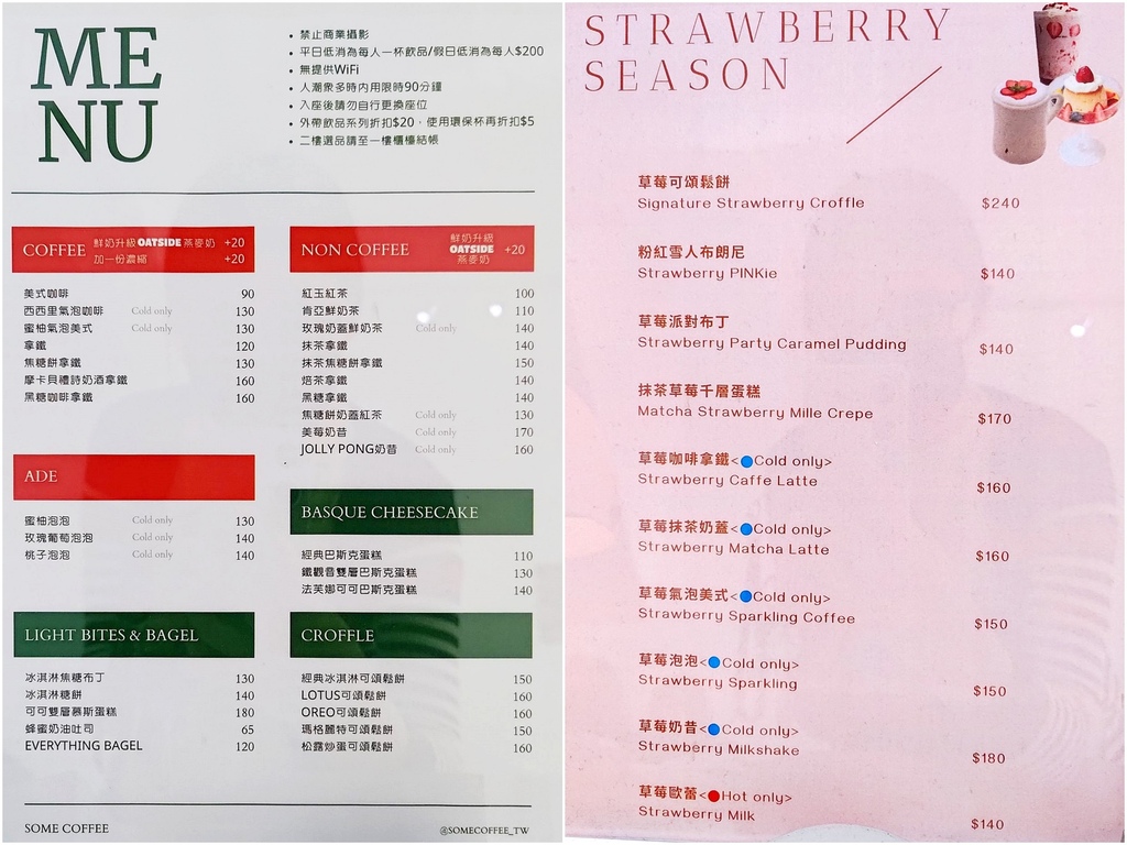 附上 썸Some Coffee菜單。平日的低消是一杯飲料,假日則是每人200元。