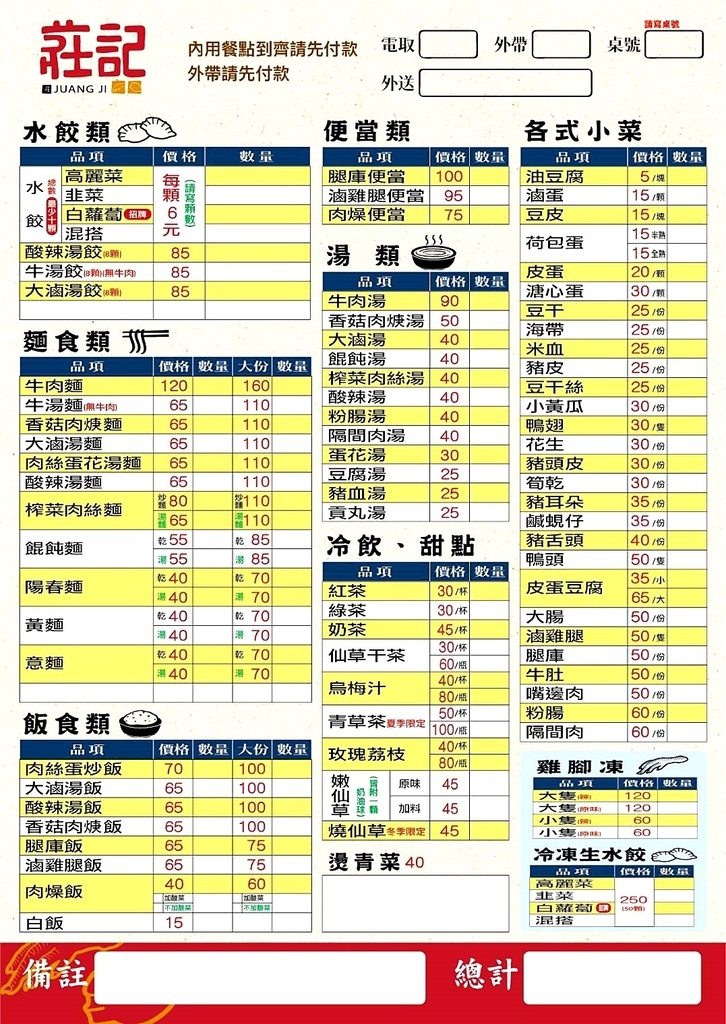莊記水餃雞腳凍菜單