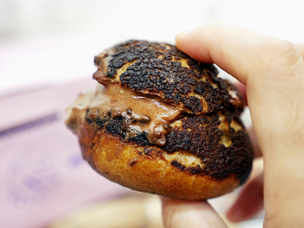 加熱過的泡芙殼變得酥脆,而中間的巧克力卡士達呈現雙重風貌。靠外側的微融更絲滑,而中間仍是冰心狀態,冷熱交織蠻有特色。但相對冰心的狀態來說,加熱後會稍嫌油膩。