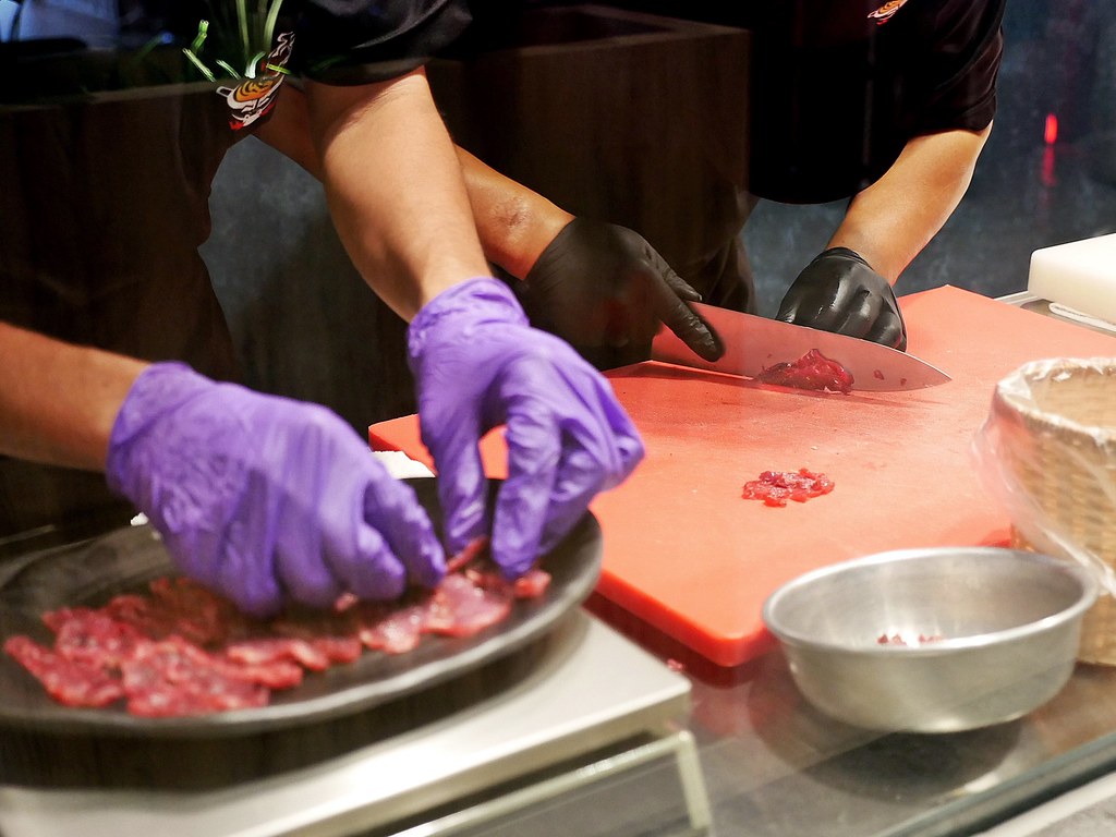 牛境牛肉鍋的肉盤通通現點現切,處理牛肉的料理台設置在廚房外頭,顧客能看到師傅透過俐落的刀工切下一片片牛肉。