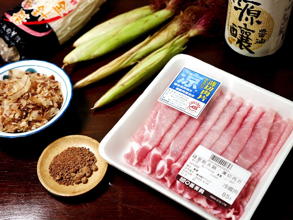 | 食材: 里肌薄肉片、金針菇、玉米筍、醬油、柴魚片、糖 |