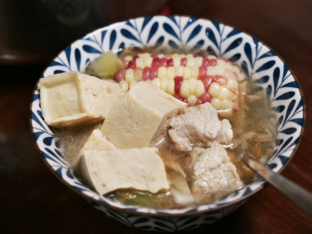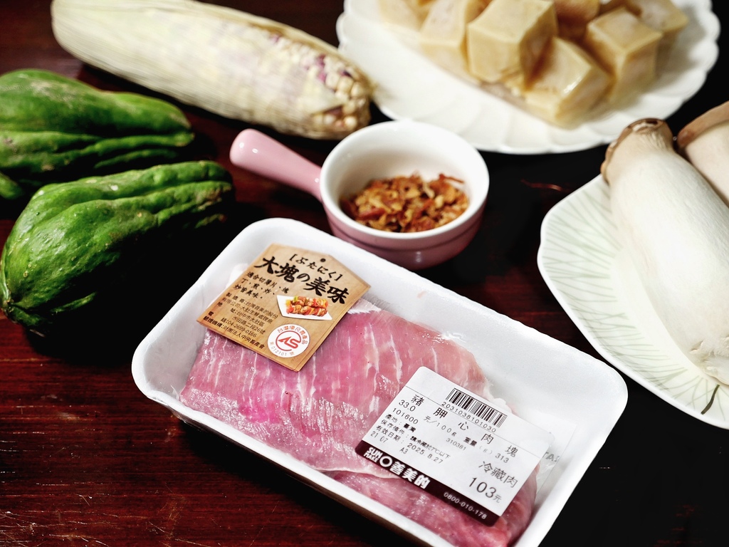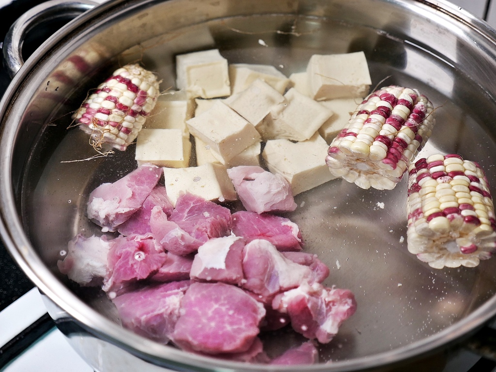 | 食材: 胛心肉、佛手瓜、玉米、杏鮑菇、凍豆腐、油蔥酥、鹽巴、胡椒 |