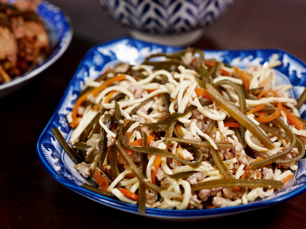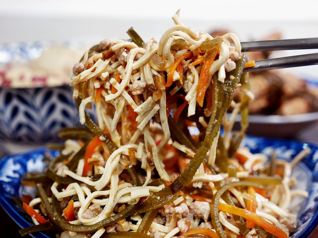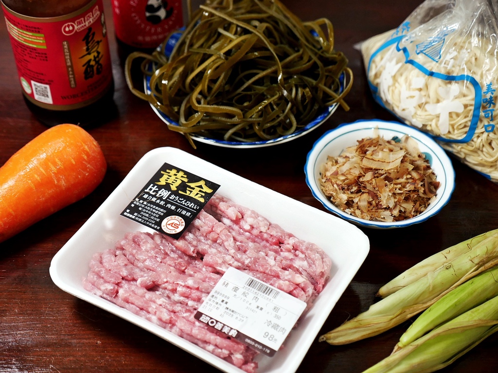 | 食材: 豬肉絞肉(粗)、豆干絲、海帶絲、紅蘿蔔、柴魚片、烏醋、蠔油、胡椒 |