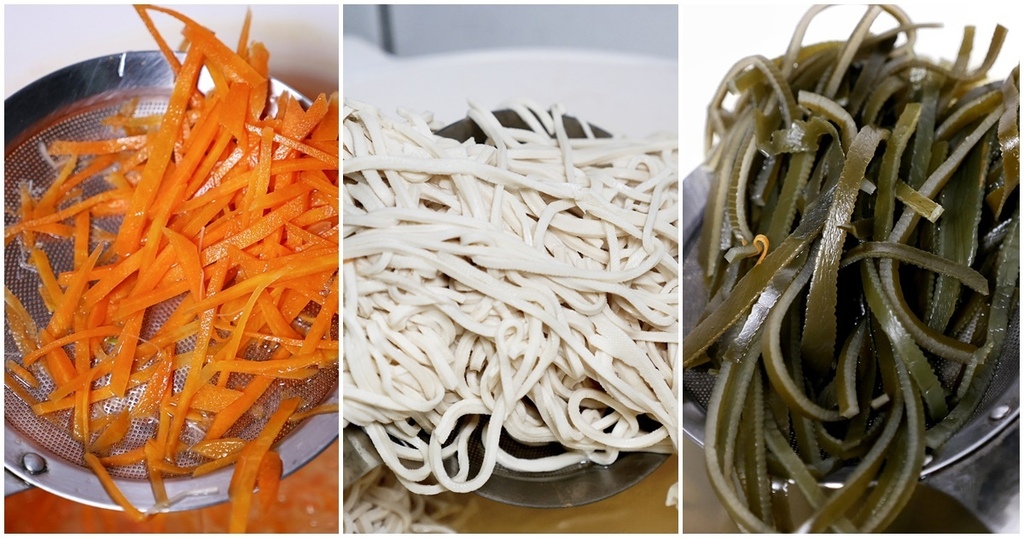 燒一鍋水,依照紅蘿蔔、豆干絲、海帶絲的順序依序燙熟後撈起瀝乾。