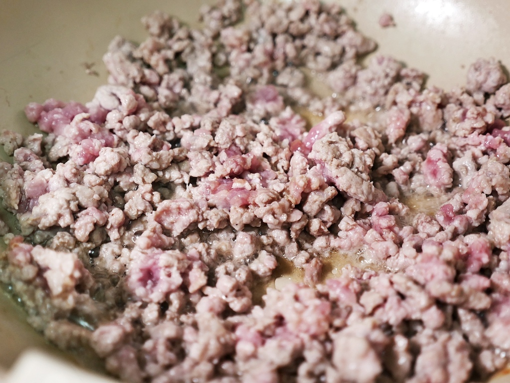 川燙食材的同時,另起一個炒鍋將絞肉炒熟,可以簡單加點胡椒、鹽巴、蠔油、烏醋去提味。