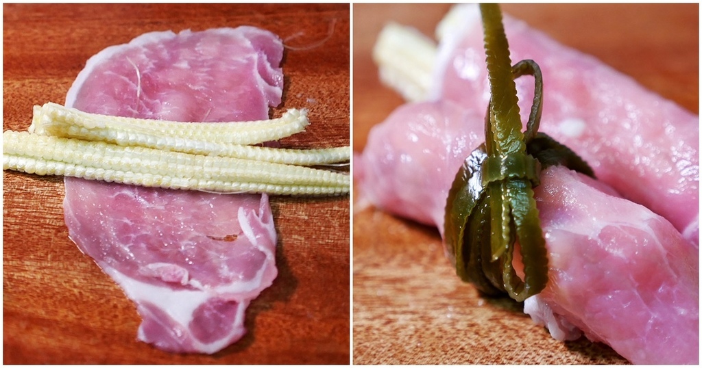 拿來捲在肉片內的蔬菜,建議挑選不要太容易變軟爛,而且要好煮熟。像減重期不少人推薦的玉米筍和金針菇等等,都是低醣高纖的好選擇。